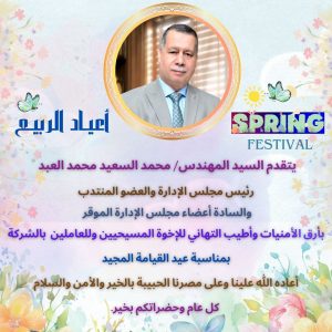 يتقدم السيد المهندس/ محمد السعيد محمد العبد ـ رئيس مجلس الإدارة والعضو المنتدب بخالص التهانى وأسمى الأمانى لجميع العاملين بالشركة...
