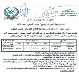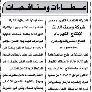 تعلن شركة وسط الدلتا لإنتاج الكهرباء عن طرح مناقصة عامة رقم 2026/2025/3 ، بنظام المظروف الواحد جلسة فتح المظاريف الفنية...