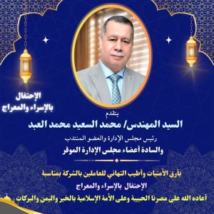يتقدم السيد المهندس/ محمد السعيد محمد العبد رئيس مجلس الإدارة والعضو المنتدب بخالص التهاني وأسمى الأماني لجميع العاملين بالشركة وللشعب...
