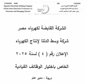 إعلان رقم (4) لسنة 2025 بشركة وسط الدلتا لإنتاج الكهرباء لشغل بعض الوظائف القيادية