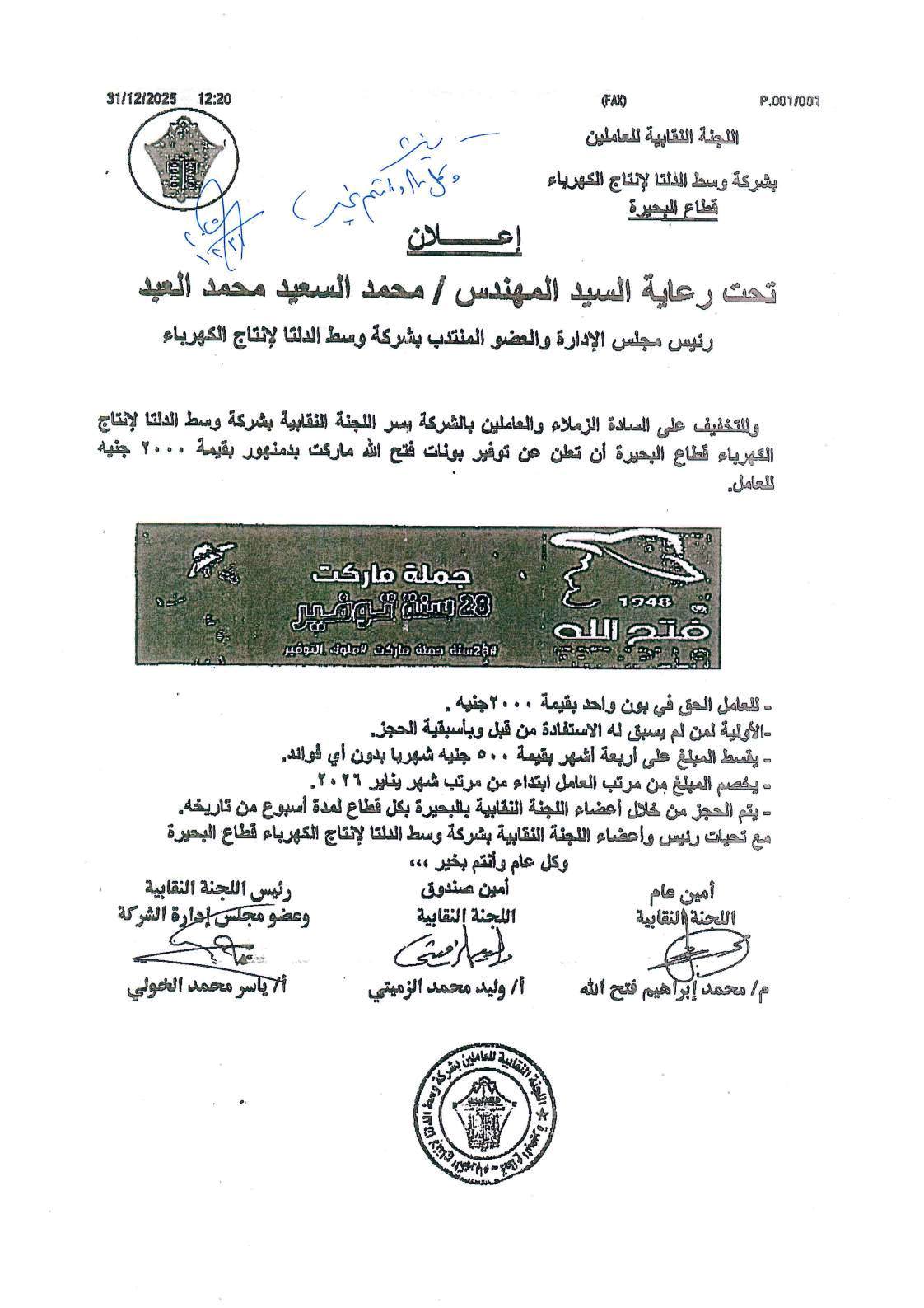 وللتخفيف على السادة الزملاء والعاملين بالشركة يسر اللجنة النقابية بشركة وسط الدلتا لإنتاج الكهرباء بقطاع البحيرة أن تعلن عن توفير بونات فتح الله ماركت و جملة ماركت بقيمة 2000 جنية للعامل.