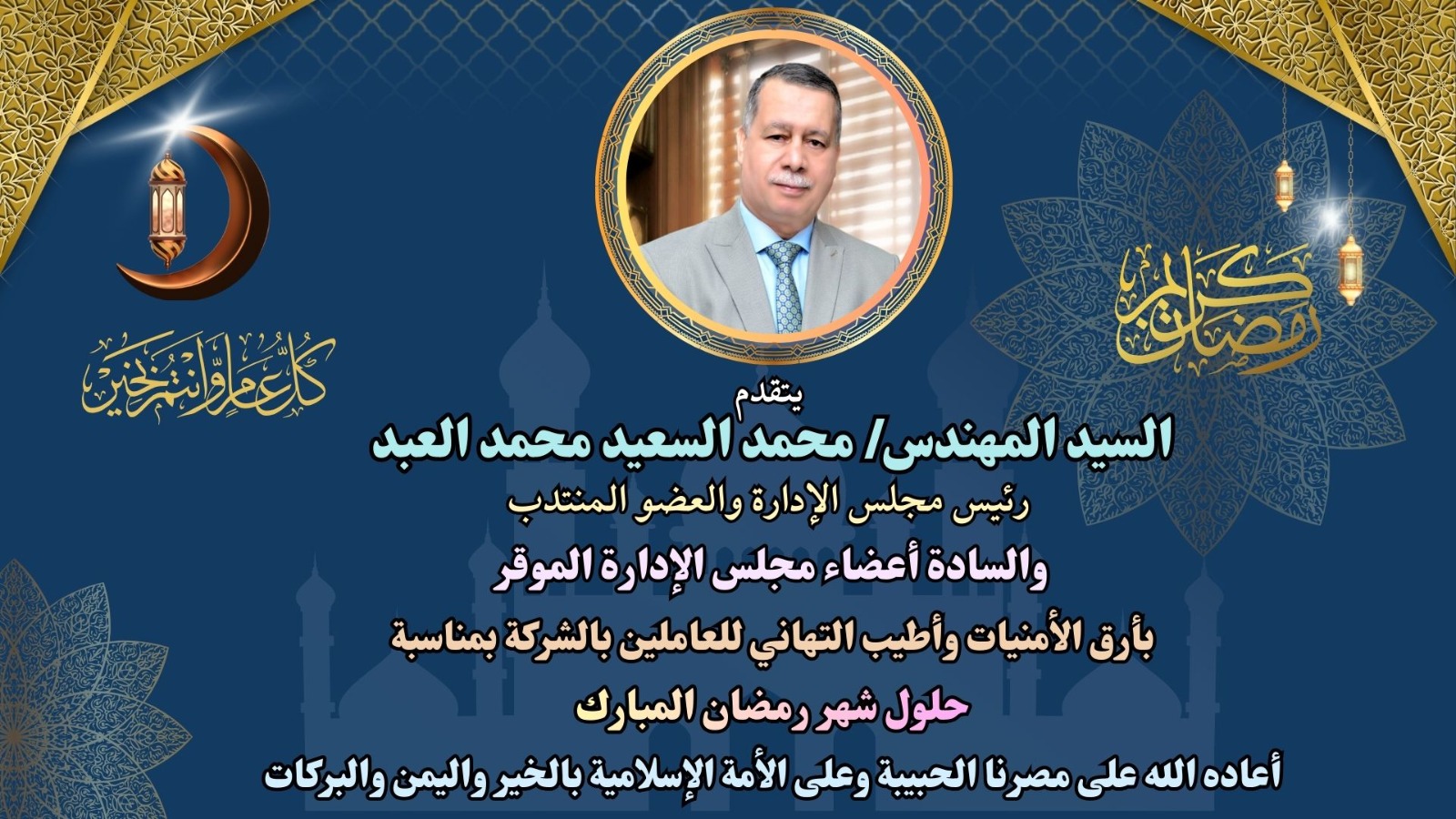 يتقدم السيد المهندس/ محمد السعيد محمد العبد – رئيس مجلس الإدارة والعضو المنتدب بخالص التهنئة إلى السيد المهندس / عبد المنعم رمضان إبراهيم الجايح لقيامه بأعمال وظيفة – مدير عام الإدارة العامة للكيمياء بقطاع محطة كهرباء النوبارية.