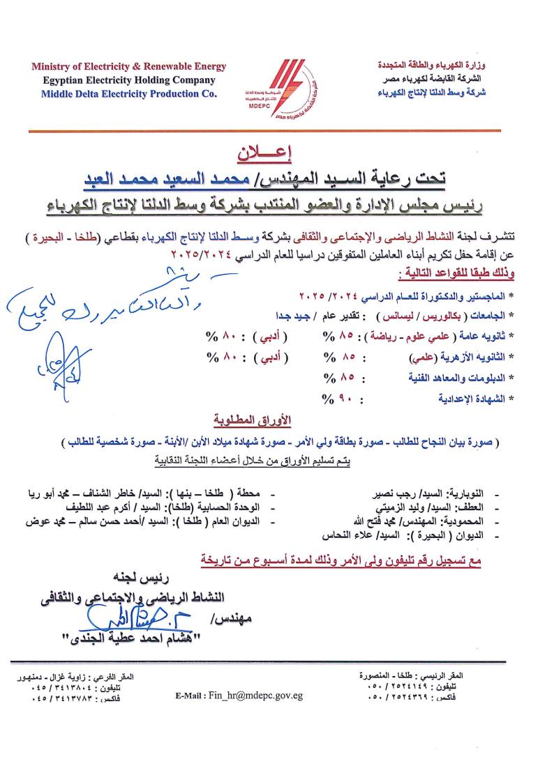 تتشرف لجنة النشاط الرياضي والإجتماعي والثقافي بشركه وسط الدلتا لإنتاج الكهرباء بقطاعي (طلخا – البحيره) عن إقامة حفل تكريم أبناء العاملين المتفوقين دراسيا للعام الدراسي 2024-2025 وذلك طبقا للقواعد التالية :