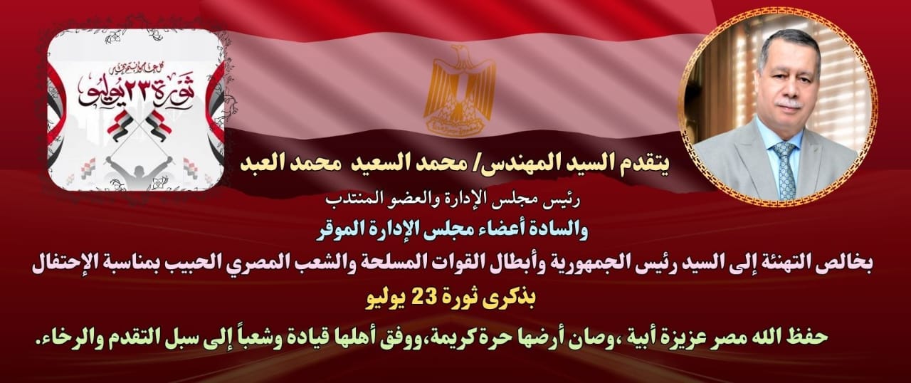 يتقدم السيد المهندس/ محمد السعيد محمد العبد – رئيس مجلس الإدارة والعضو المنتدب والسادة أعضاء مجلس الإدارة الموقر ، بخالص التهنئة للعاملين بالشركة وللشعب المصري العظيم بمناسبة الإحتفال بذكرى ثورة 23 يوليو .