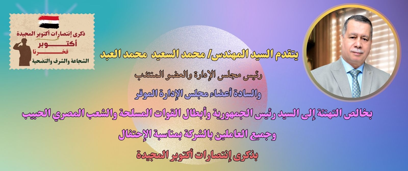 يتقدم السيد المهندس/ محمد السعيد محمد العبد رئيس مجلس الإدارة والعضو المنتدب، والسادة أعضاء مجلس الإدارة الموقر بخالص التهنئة إلى السيد رئيس الجمهورية القائد الأعلى للقوات المسلحة وأبطال القوات المسلحة والشعب المصري الحبيب وجميع العاملين بالشركة بمناسبة ذكرى إنتصارات أكتوبر المجيدة.