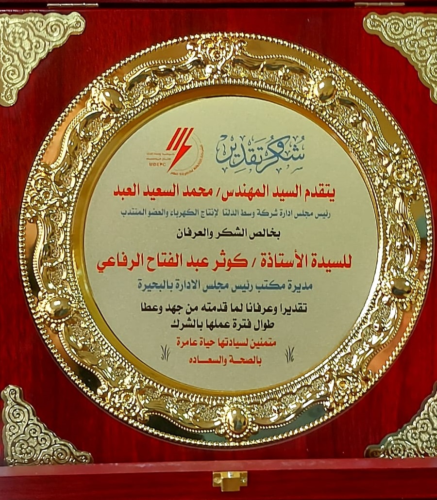 تم اليوم السبت الموافق 2026/4/18 إقامة حفل تكريم للسيدة الأستاذة / كوثر عبد الفتاح الرفاعى – مديرة مكتب رئيس مجلس الإدارة بالبحيرة بمناسبة بلوغ سيادتها سن المعاش شاكرين سيادتها على دماثة أخلاقها ومجهوداتها في العمل داعين الله عز وجل لها بدوام التوفيق والصحة والعافية .