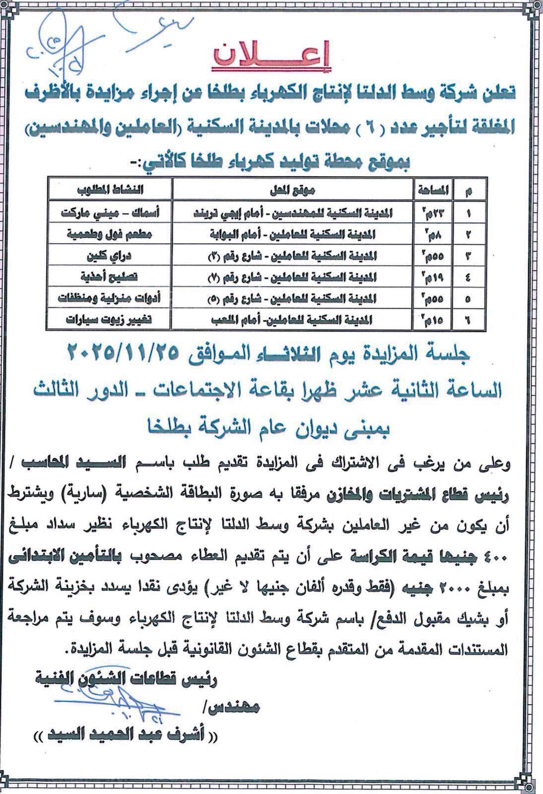 تعلن شركة وسط الدلتا لانتاج الكهرباء بطلخا عن اجراء مزايدة بالأظرف المغلقة لتأجير عدد (٦) محلات بالمدينة السكنية (العاملين والمهندسين) بطلخا كما هو موضح بالإعلان ، جلسة المزايدة يوم الثلاثاء الموافق 2025/11/25 الساعة 12 ظهرا بقاعة الإجتماعات بالدور الثالث بمبنى ديوان عام الشركة بطلخا .