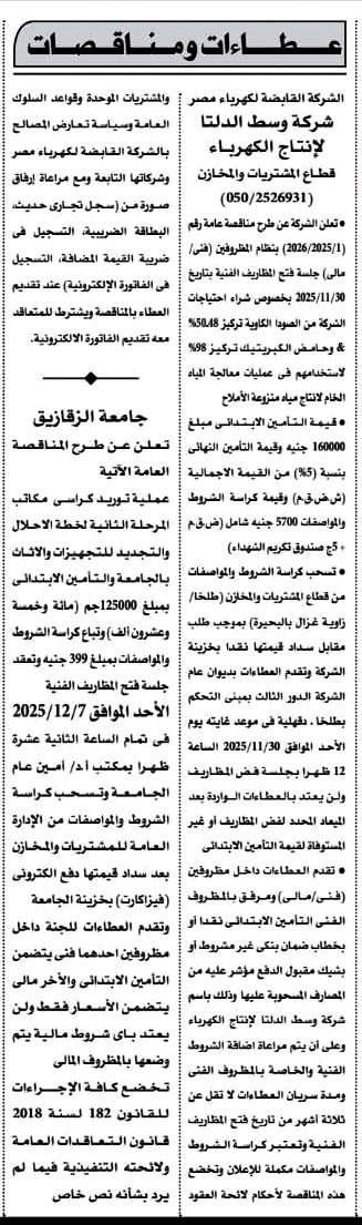 تعلن شركة وسط الدلتا لإنتاج الكهرباء عن طرح مناقصة عامة رقم 2026/2025/1 ، بنظام المظروفين ( فني /مالي) جلسة فتح المظاريف الفنية بتاريخ 2025/11/30 بخصوص شراء إحتياجات الشركة من الصودا الكاوية تركيز 48-50%، حامض الكبريتيك تركيز 98% لإستخدامها لمعالجة المياه الخام لإنتاج المياه منزوعة الأملاح.