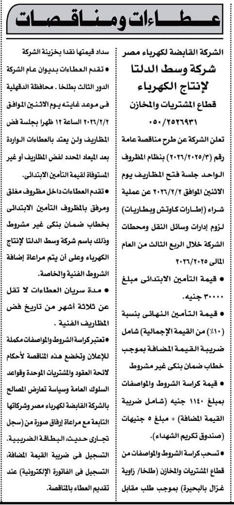 تعلن شركة وسط الدلتا لإنتاج الكهرباء عن طرح مناقصة عامة رقم 2026/2025/3 ، بنظام المظروف الواحد جلسة فتح المظاريف الفنية بتاريخ 2026/2/2 بخصوص شراء إطارات كاوتش وبطاريات لزوم إدارة وسائل النقل ومحطات الشركة .