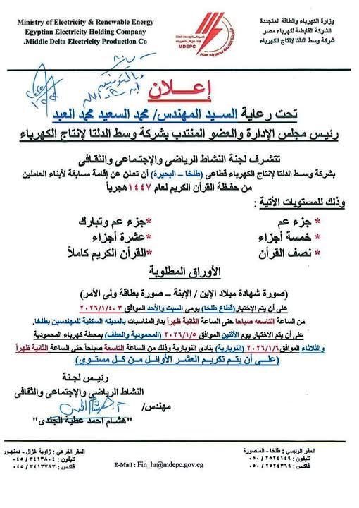 يسر لجنة النشاط الرياضى والاجتماعى والثقافى بشركة وسط الدلتا لإنتاج الكهرباء بقطاعى (طلخا – البحيرة) عن إقامة مسابقة لأبناء العاملين من حفظة القرآن الكريم لعام 1447 هجريا.