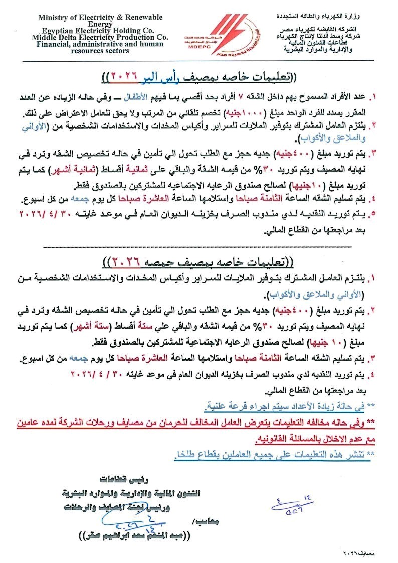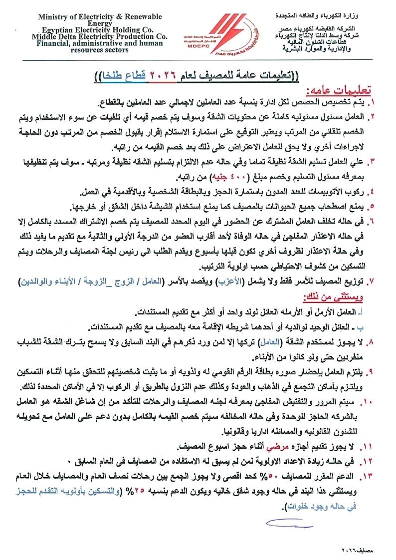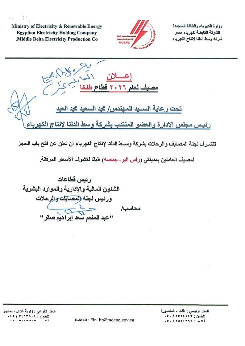 تتشرف لجنة المصايف والرحلات بالشركة ان تعلن عن فتح باب الحجز لمصيف العاملين بمدينتى رأس البر وجمصة قطاع طلخا.