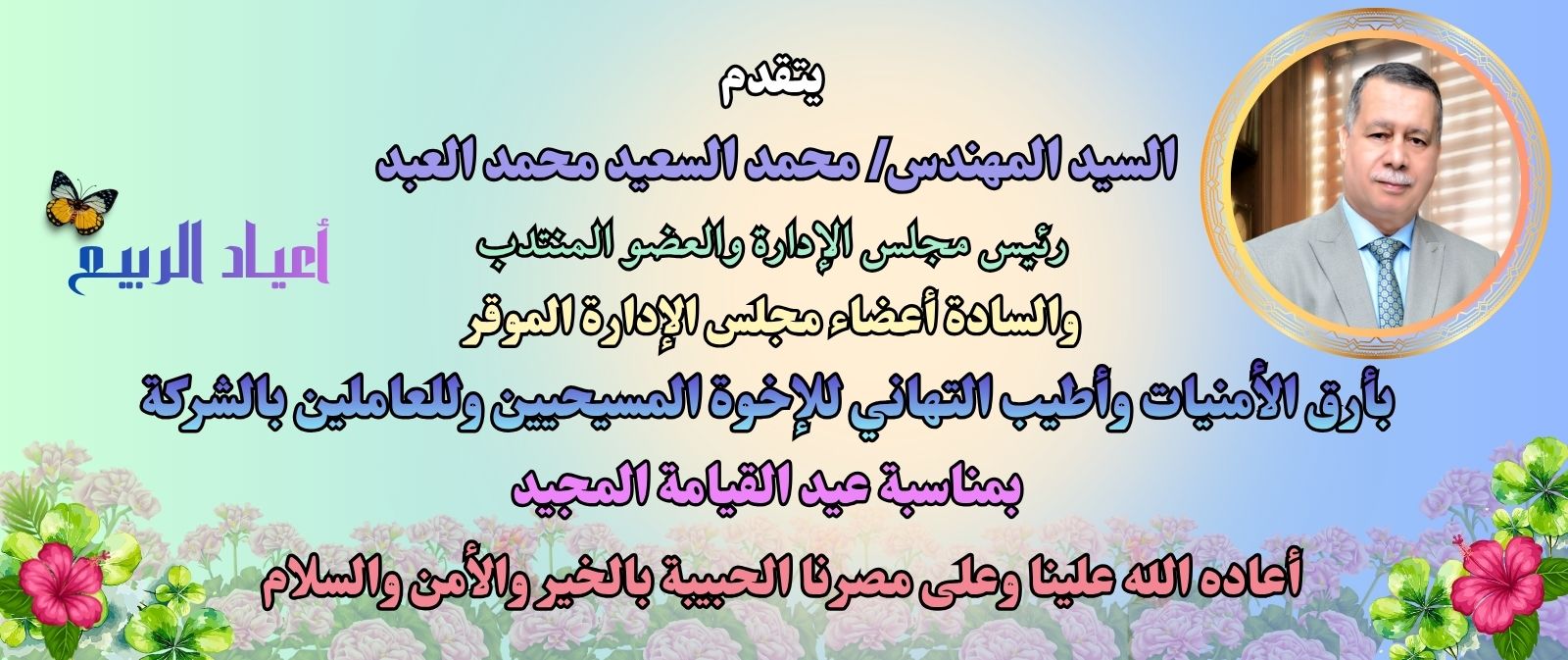 يتقدم السيد المهندس/ محمد السعيد محمد العبد ـ رئيس مجلس الإدارة والعضو المنتدب بخالص التهاني للأخوة الأقباط وللعاملين بالشركة بمناسبة عيد القيامة المجيد وأعياد الربيع.