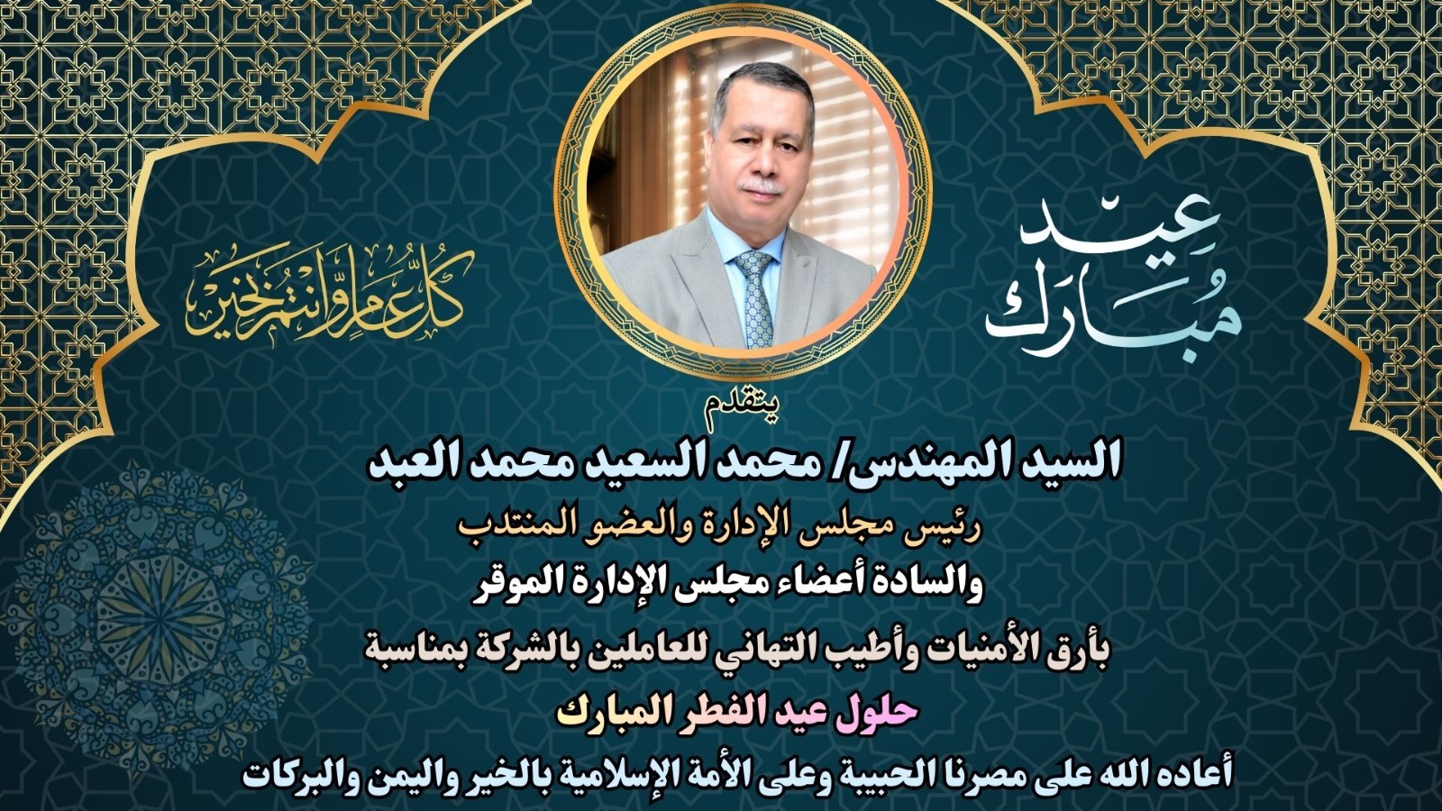 يتقدم السيد المهندس/ محمد السعيد محمد العبد ـ رئيس مجلس الإدارة والعضو المنتدب بخالص التهانى وأسمى الأمانى لجميع العاملين بالشركة وللشعب المصرى و للأمة الإسلامية بمناسبة حلول عيد الفطر المبارك.